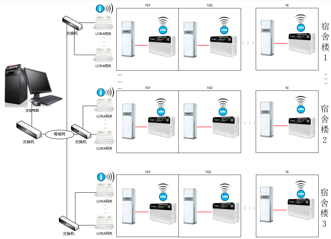 · 適用場景:宿舍樓分布分散或施工布線困難(如老舊建筑改造)。例如,某高校老舊宿舍樓因建筑結(jié)構(gòu)復雜,無法大規(guī)模布線,適合采用LORA無線組網(wǎng)方案。