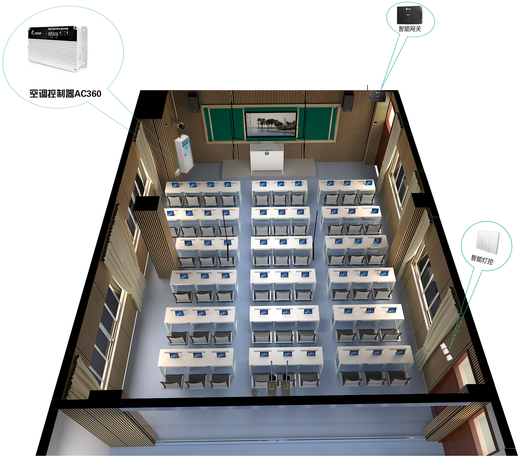 多媒體教室、實驗室等功能室使用頻率低(如每周 2-3 次),且使用時間不固定,策略設(shè)計重點關(guān)注 “按需開啟、即時關(guān)停”: