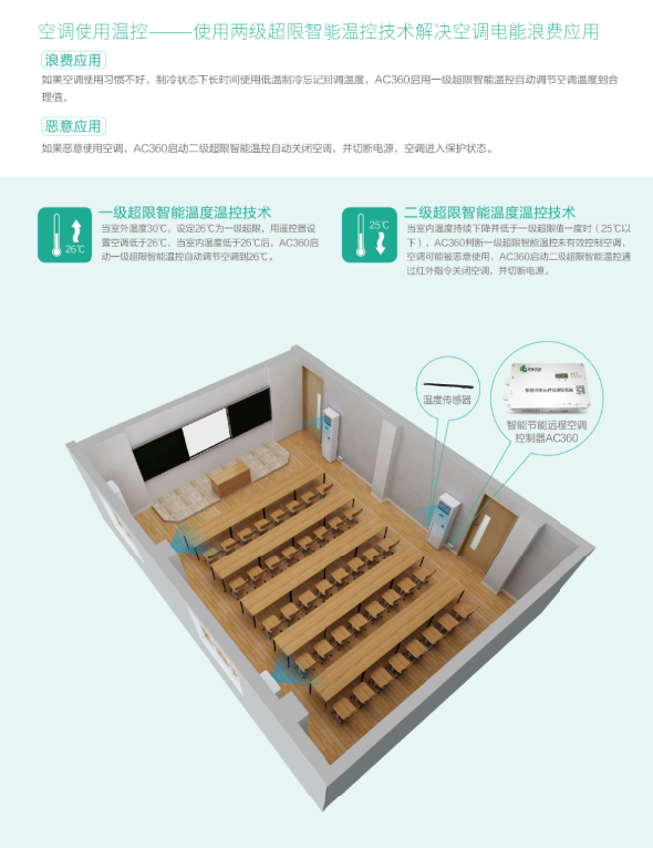 廣州派谷電子在針對(duì)教室空調(diào)難控制的問(wèn)題研發(fā)了有線和無(wú)線的兩種方案,采用旗下空調(diào)智能產(chǎn)品分體空調(diào)智能集中控制器AC360,以實(shí)現(xiàn)以下功能: